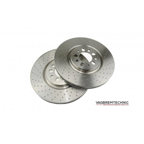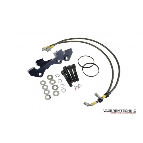 The caliper carriers are made from lightweight aluminium. These have steel thread inserts for strength along with a black anodised finish. The supplied front brake lines have been made to our specifications by HEL Performance, which include stainless steel fittings and are finished in their carbon black sheathing. The 1 piece brake discs are 330x28mm from a different vehicle manufacturer which we have modified to allow fitment to your car. We dimple the discs to give it that Porsche turbo look. We also include hub centering rings which reduce the larger center bore of these discs to match VAG hubs to ensure correct fitment. Lastly the fitting kit includes bolts that are high tensile M12x1.25 coupled with quality spring washers.