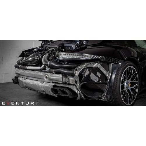 The 991 Turbo Eventuri intake system was developed through extensive real world testing with the aim of allowing the turbos to work more efficiently. By replacing the single stock airbox with individual patented Venturi filter housings, the turbos are able to spool and generate boost with less drag. As a result, the wastegate duty cycles are reduced resulting in peak boost at lower RPM and therefore performance is increased. The two individual filters provide a larger filtration area as compared to the single stock panel filter. Furthermore, in order to keep inlet air temperatures down, the Venturi housings are sealed against an air duct which draws ambient air from the same location as the stock system. Since the 911 Turbo engine bay is densely packed, high IATs can only be avoided by ensuring a fully sealed intake system. The combination of a smoother airflow path to each turbo with low IATs results in higher performance and a sharper throttle response over the stock airbox.